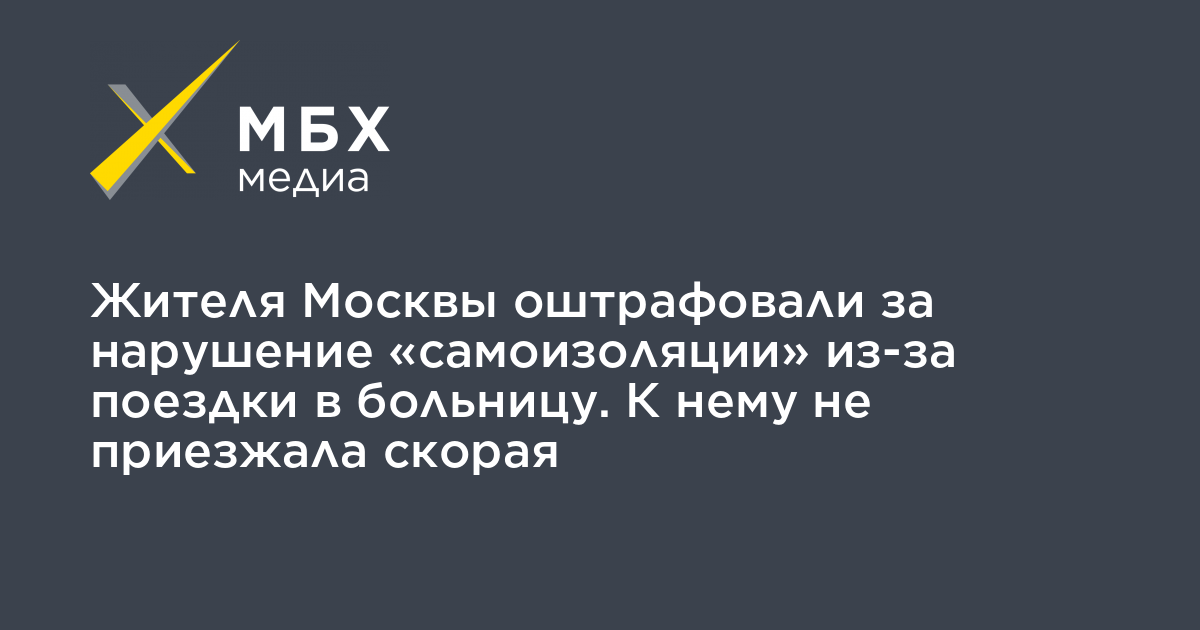 Житель Москвы Никита Савин рассказал, что его отца, заразившегося коронавирусом, оштрафовали на 4 тысячи рублей за нарушение режима изоляции после того, как он поехал в больницу из-за отказа скорой помощи приезжать на вызов. Об этом Савин сообщил «МБХ медиа».