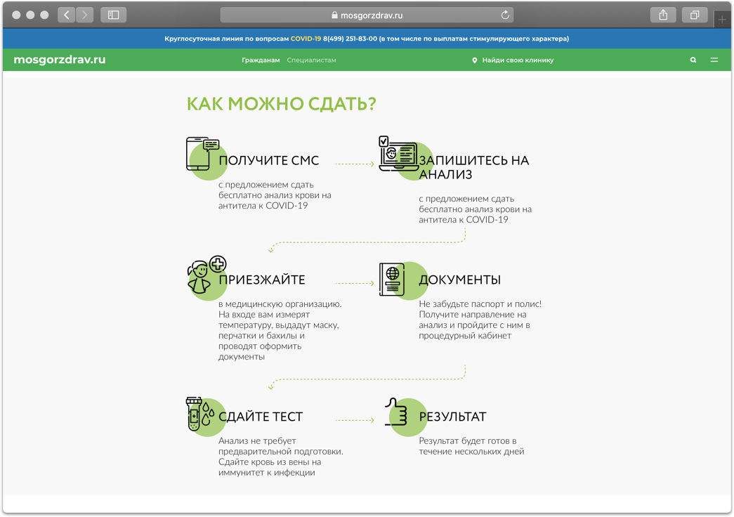 Для проведения тестирования выбрали метод иммуноферментного анализа (ИФА), позволяющий выявить в крови человека наличие как самой инфекции, так и маркера иммунитета к ней. Сдать анализ можно бесплатно, но только по специальному приглашению. Раз в несколько дней оно приходит по смс или электронной почте 70 тысячам москвичей (к концу месяца планируется проводить 200 тысяч анализов в сутки). Рассылка проводится случайным образом с учетом «возрастной структуры населения» и округа проживания. По ссылке из приглашения можно записаться онлайн на прием в одну из 30 участвующих в программе поликлиник. Забор крови в каждой из них проводят одновременно в двух кабинетах.