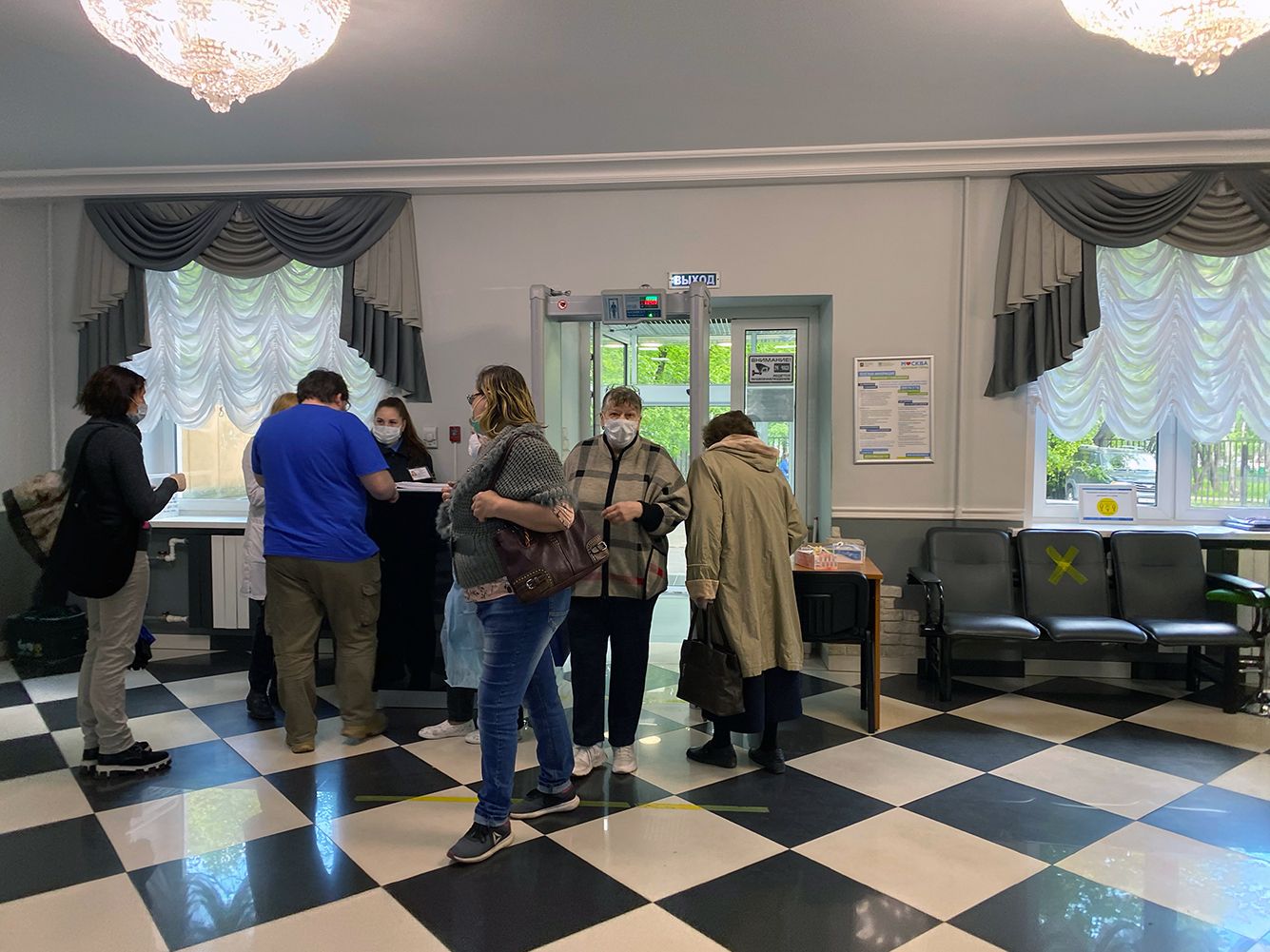 В эту же, 64-ю поликлинику утром 17 мая отправилась фоторедактор «Медузы» Александра Горохова — после того, как получила приглашение на тестирование. По ее словам, вход в здание был организован с обратной стороны; при этом человек попадал сразу в середину скопившейся в коридоре очереди. Температуру на входе никому не измеряли, а перчатки, маски и бахилы находились у главного входа в поликлинику, через который также заходили люди. При этом далеко не весь персонал использовал рекомендуемые средства индивидуальной защиты. «Одновременно в коридоре находились 40-50 человек. В лучшем случае они стояли в метре друг от друга, потому что места не было», — рассказывает Горохова. В ответ на жалобу женщины из очереди на стойке регистрации ответили: «Вот кто вам смску прислал, туда и обращайтесь».