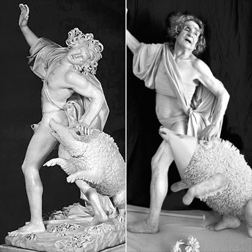 Кстати говоря, для популяризации современного искусства в России среди широкой публики делается в сравнении с европейскими музеями не так уж много. Одно из приятных исключений представляет собой ПЕРММ, объединяющий в последние годы разные возрастные категории — есть проекты и для подростков, и для пожилых посетителей. Примечательно, что во флешмобе «Изоизоляция» с его первых дней просматривался уверенный тренд на инклюзивность: очень многие включают в «картины» как собственных пожилых родителей, так и детей с ограниченными возможностями. Среди самых популярных постов в группе, которые набирали десятки тысяч лайков, мне запомнились работы по мотивам скульптур на античные сюжеты художницы Галины Блейх: ее 90-летняя мама изображает то погибающего от клыков вепря Адониса, то Аполлона Бельведерского, а то и — в размноженном в фотошопе виде — играет одновременно Амура и Психею или всех героев скульптуры «Лаокоон и его сыновья». Здесь домашняя игра в искусство претендует уже на концептуальный проект, и это перекликается с существующими работами профессиональных фотографов с участием пожилых родителей (например, известной серией американского фотографа Алин Смитсон «Композиция в зеленом и черном, портреты матери фотографа», вдохновением для которой послужил портрет матери кисти Джеймса Уистлера).