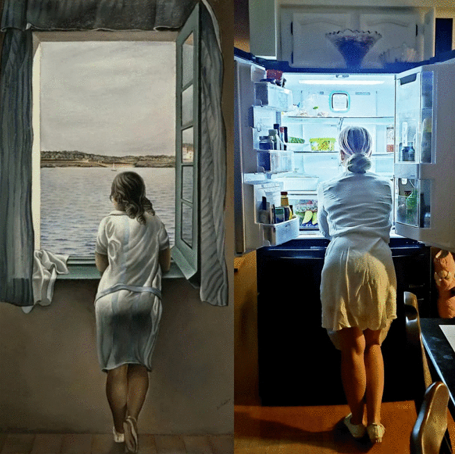 Весьма характерны и женские портреты, снятые мужчинами (кстати, часто профессиональными фотографами), старательно и без всякого намека на иронию стремящимися запечатлеть своих подруг в эротичных позах в попытке скопировать див с известных живописных полотен. И, напротив, зачастую весьма ироничны автопортреты женщин, создающих композиции, где, например, роль распахнутого окна с картины Сальвадора Дали играет раскрытый холодильник — сюжет прямо в духе австралийского блогера и комика Селест Барбер, которая известна своими «бытовыми» пародиями на идеальные образы героинь рекламной и фэшен-фотографии.
