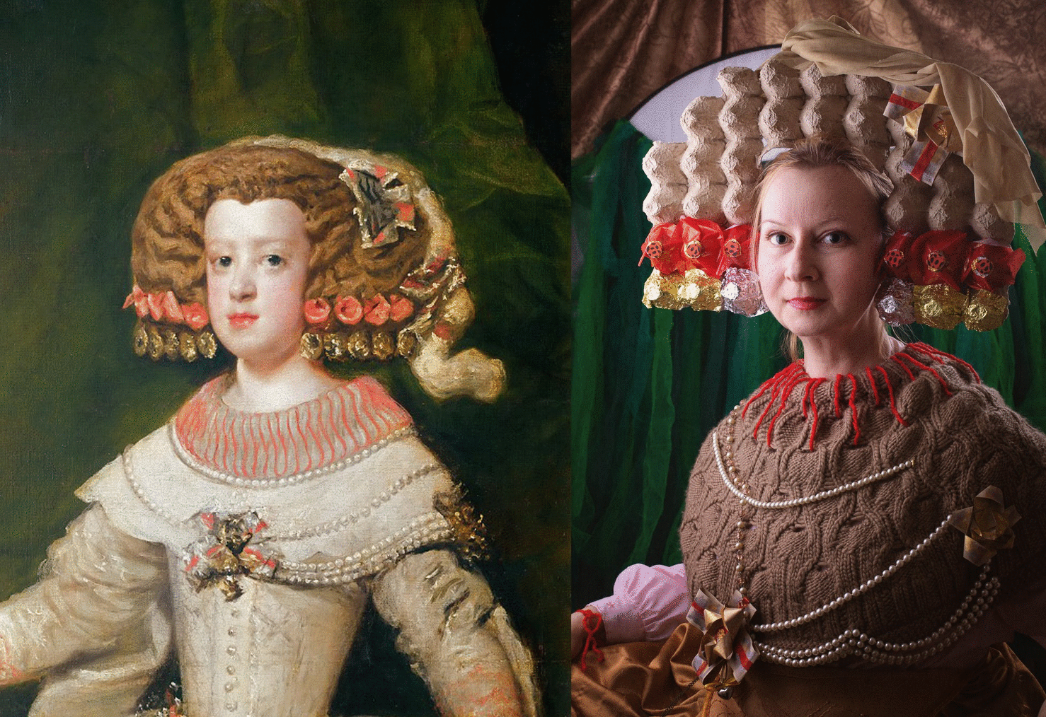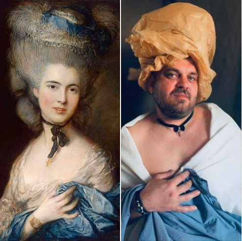 Любой концепт строится на ограничениях — единообразии и согласованности в использовании материалов, композиции, метода. В случае «Изоизоляции» эти ограничения возникли сами собой: выходить из дома нельзя, магазины закрыты, подходящие костюмы не купить, поэтому обходимся тем, что есть (у кого-то, впрочем, оказались даже дома запасы театрального грима и париков, но это, скорее, исключение). В таком случае кудри напудренного парика накручиваются из туалетной бумаги (куда же без нее), а роль шляпы играет тазик из ванной.