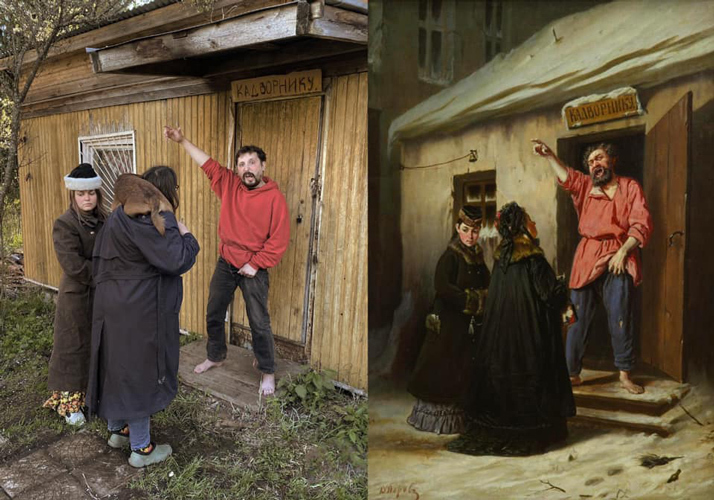 © Евгений Гуревич, #изоизоляция Над городом. Марк Шагал. 1918 Во многих случаях авторы не только публикуют результат, но и описывают, как именно проходил процесс, с какими сложностями они столкнулись и какие подручные материалы были использованы — накладные ресницы, гречка, маски… Женщины нередко подчеркивают, как сопротивлялись съемке их мужья, как изначально трудно было уговорить их принять участие, надеть аксессуары, принять позу — и как мужчины затем вошли в роль. «Риск» связан не только с открытой игровой ситуацией, но и с тем, что в постановках мужьям нередко уготована перемена пола: с самого начала проекта снимки, построенные на гендерной инверсии, неизменно набирают огромное количество лайков и отзывов. Большой энтузиазм у женщин вызывают и «кровавые» сюжеты вроде Юдифи с головой Олоферна или Саломеи с головой Иоанна Крестителя, где мужчина исполняет роль поверженного героя.