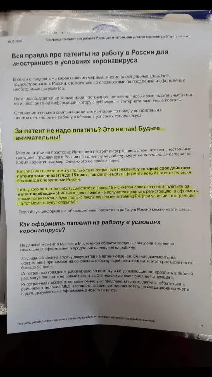 Бумага, которую рассылает работодатель, представляет собой распечатку скриншота с сайта одной юридической компании, специализирующейся в том числе на миграционном праве. Там обещают рассказать «всю правду про патенты на работу в России». Желтым маркером подчеркнут заголовок: «За патент не надо платить? Это не так! Будьте внимательны!» Дальше объясняется, что патент могут не оплачивать только те, у кого срок действия патента заканчивается до 15 июня, а тем, у кого действует и после, якобы платить необходимо.
