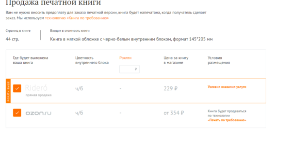 Есть три варианта продажи: продажа в оффлайне, в онлайне и всё вместе. В первом случае Ridero сотрудничает с «Читай-городом», «Буквоедом», «Москвой» и «Библио-глобусом». Онлайн — Ozon, Amazon, Bookmate и «Литрес».