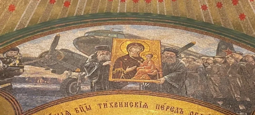 Апофеозом этого иконографического мифотворчества является мозаика «Священники облетают Москву с Тихвинской иконой по просьбе Сталина 8 декабря 1941 года».