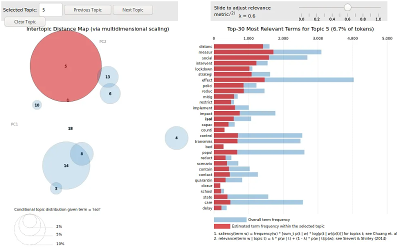 Вы также можете в интерактивном режиме оценить наполнение тем и близость между ними. Визуализация по ссылке показывает, какие слова наиболее релевантны каждой теме, и с какими темами в наибольшей степени соотносится то или иное слово. Для примера мы выделили основу isol (изол-). Заметно, что она наиболее характерна для темы 5 про нефармацевтические меры, где относится к мерам физического дистанцирования, а также для темы 14 про геном вируса, где упоминается в контексте изоляции вируса.