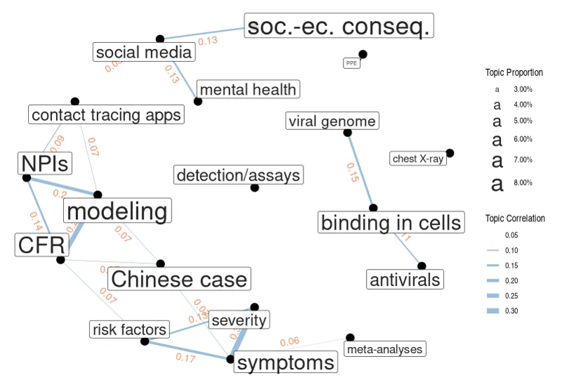 Модель, к примеру, выделяет и такую тему, как отслеживание контактов через мобильные приложения и данные о перемещениях. Во время эпидемии важно как можно раньше выявлять заражённых, и мобильные приложения позволяют намного быстрее получать данные о взаимодействиях между людьми. Даже если приложением пользуюся только 20% населения, они всё равно оказываются полезнее традиционных способов отслеживания контактов через интервью с заболевшими (Kretzschmar et al. 2020).