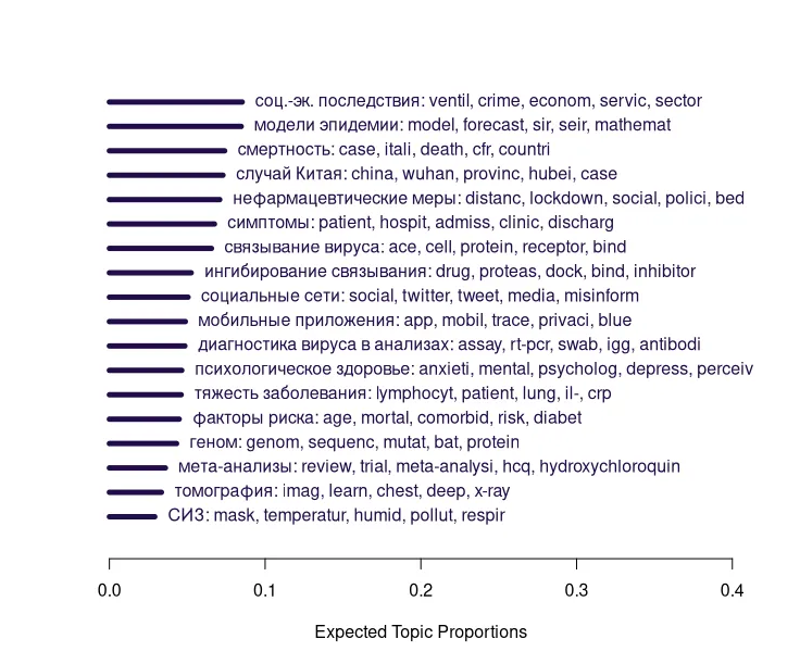 Темы, связанные с клинической медициной — тяжесть заболевания, сопутствующие болезни и факторы риска, симптомы болезни, — формируют отдельную группу. Особняком стоят биологические темы про геном вируса, молекулярные механизмы связывания вируса в клетке и подавление этого процесса.