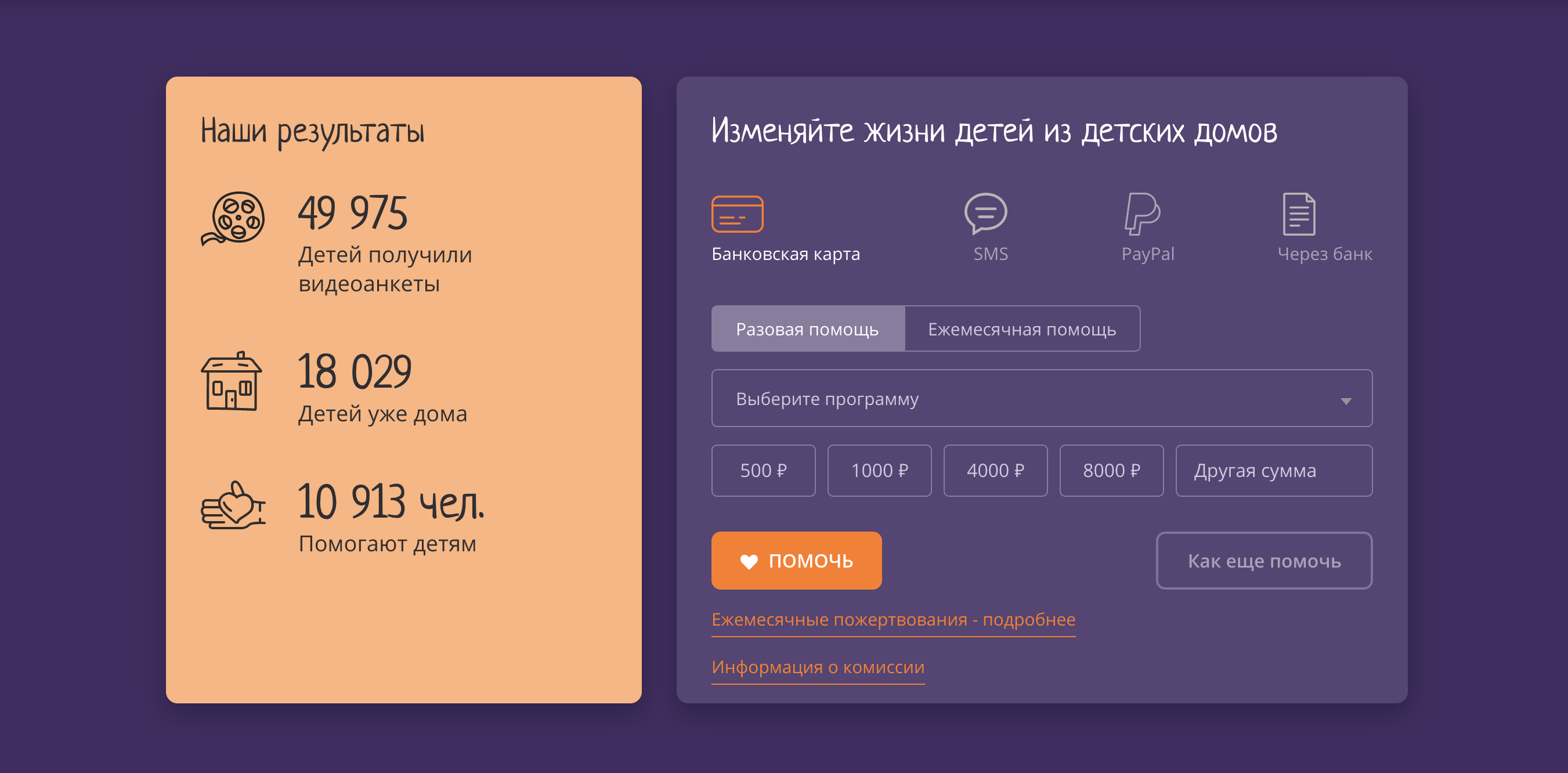 «Мы решили создать собственную платформу, потому что, во-первых, в тот момент выбор сторонних платформ для волонтерского фандрайзинга был невелик, во-вторых, чужие платформы не делятся информацией о пользователях. А это очень ценная информация для построения коммуникации и долгосрочных отношений со сторонниками, а также для предоставления персональных отчетов по каждому пожертвованию», – рассказывает Екатерина Федосова, менеджер по развитию благотворительного фонда «Измени одну жизнь».
