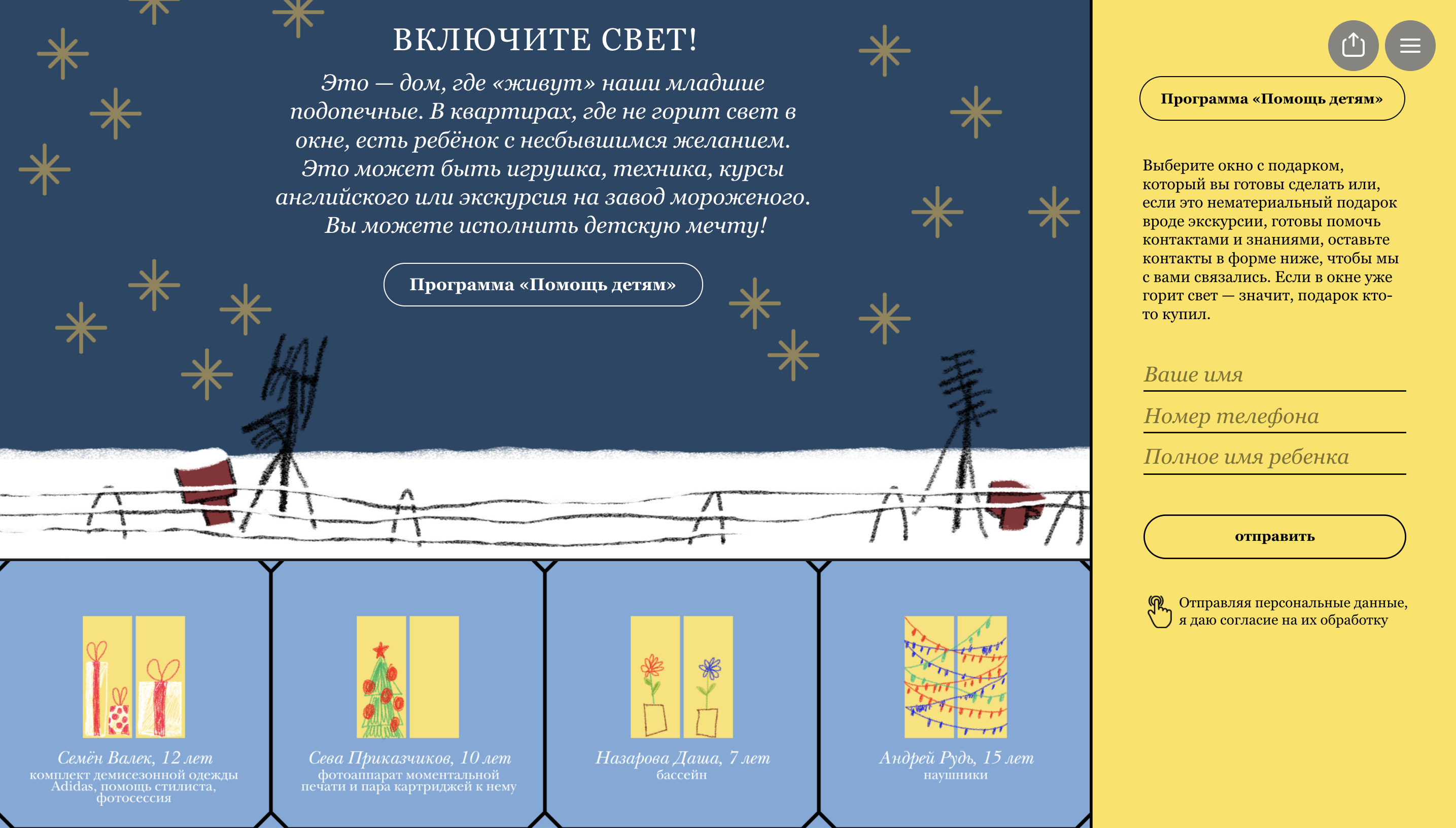 Окна «зажигались» сотрудниками фонда после того, как они получали подтверждение, что подарок действительно куплен, технически это делалось в один клик – менялась одна картинка на другую. Но сложности возникали из-за того, что к акции оказалось приковано даже больше внимания, чем планировалось. «Получалось так, что один и тот же подарок хотели купить или даже покупали разные люди, Тогда мы обсуждали с жертвователями возможность иначе распорядиться подарком – отдать другому ребенку, или оставить на будущее, потому что в течение года у наших подопечных есть дни рождения и другие праздники. Обычно все шли навстречу», – объясняет Степан.