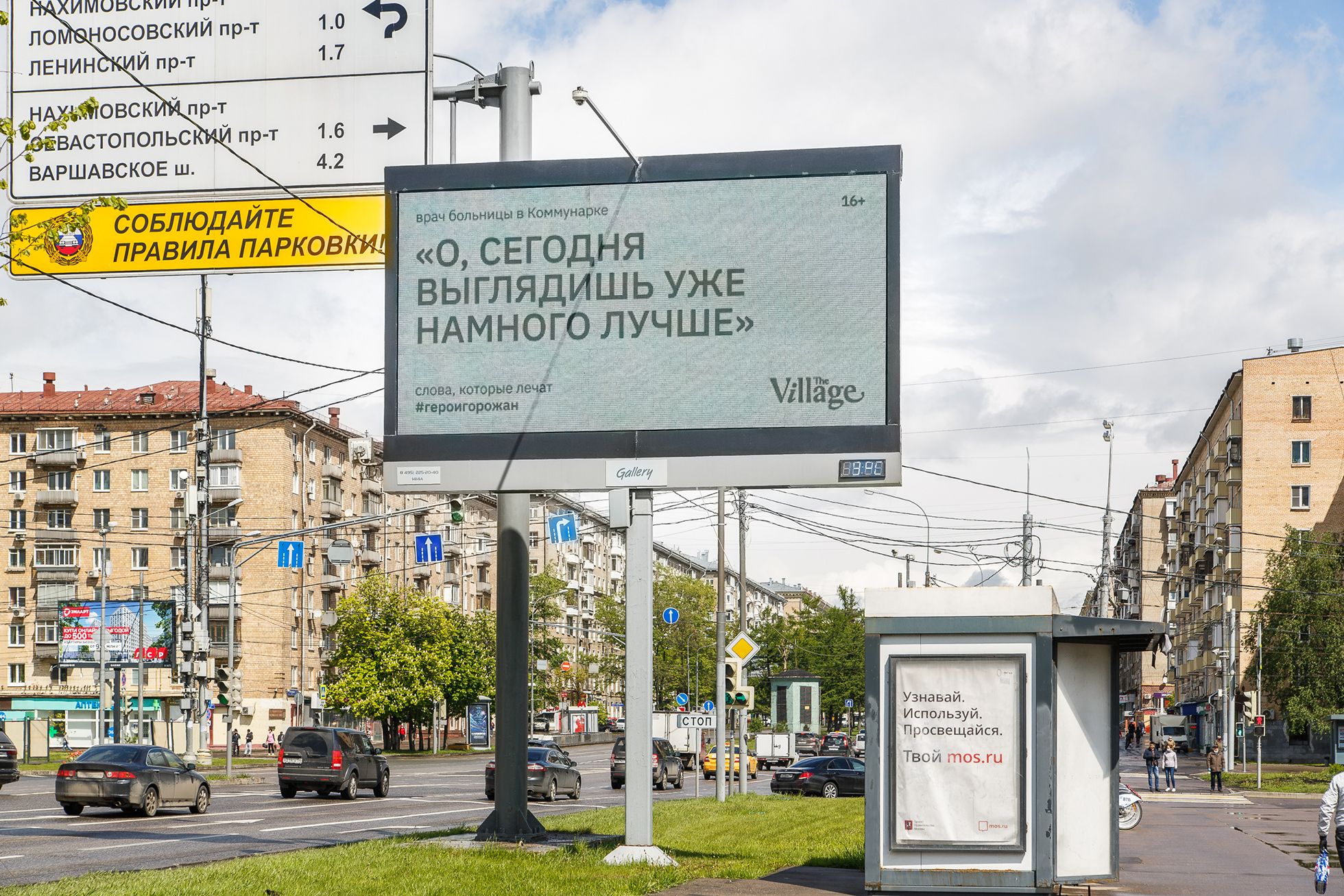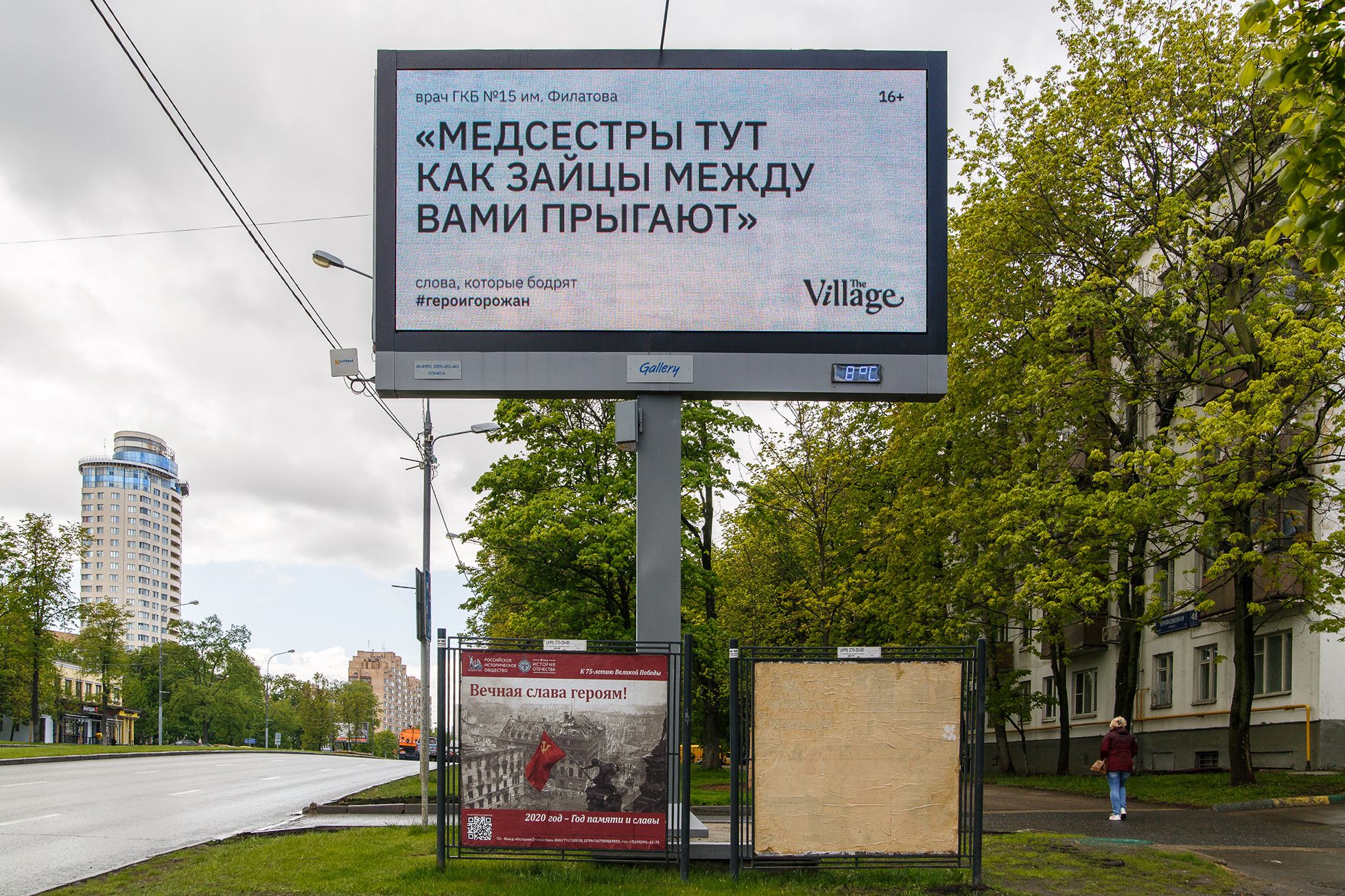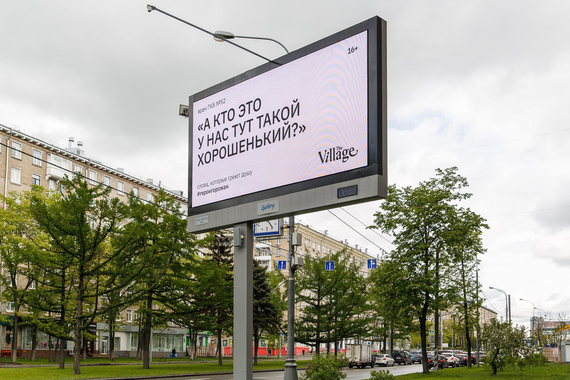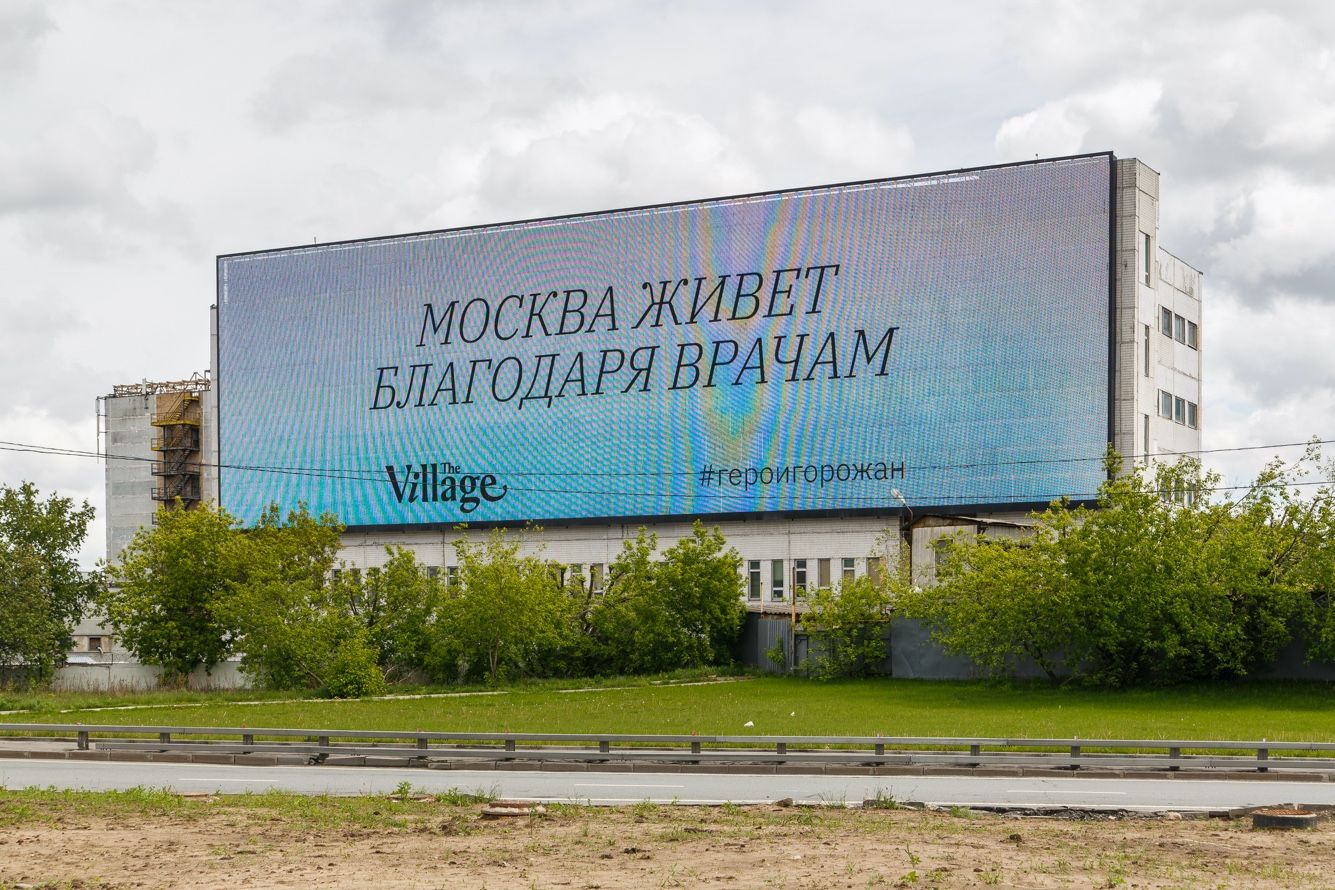 Издание The Village запустило в Москве кампанию в поддержку медиков. Она называется #героигорожан. В рамках этой кампании на нескольких московских медиафасадах разместили цитаты сотрудников больниц для пациентов с коронавирусом. Это слова, которые сами врачи говорили людям, вылечившимся от COVID-19. «Мы хотим поблагодарить медработников и подчеркнуть их значимость в жизни города», — объяснил цель кампании The Village.