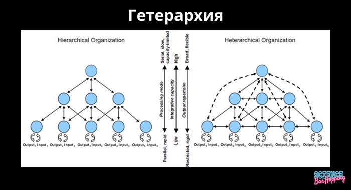 - Гетерархия (альтернатива вертикальной иерархии, горизонтальная иерархия, система сложных связей между всеми членами сообщества).