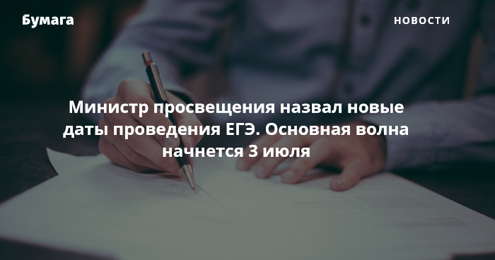 Пробные экзамены пройдут 29 и 30 июня без школьников, чтобы проверить соблюдение предписаний Роспотребнадзора. Основная волна ЕГЭ начнется 3 июля — с литературы, географии и информатики. Вторая волна экзаменов запланирована на начало августа.