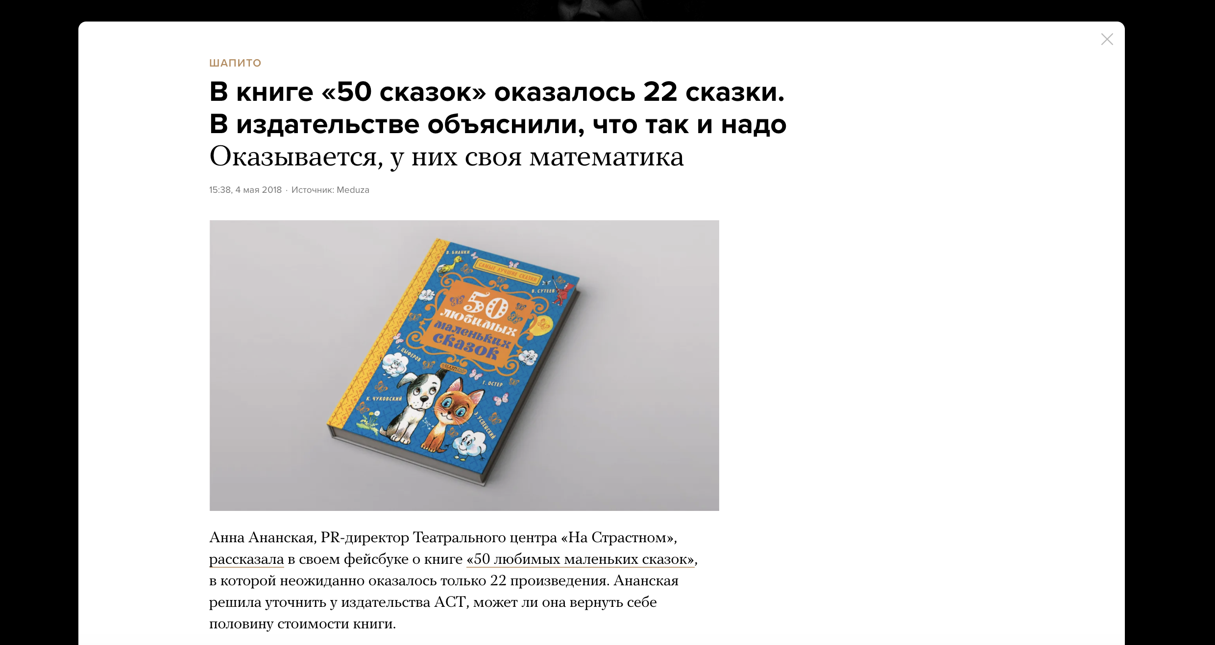 Яркий пример – кейс издательства АСТ: издательство в комментариях у недовольного блогера ответило грубо, и ситуацию тут же подхватили другие блогеры и СМИ. Вместо того чтобы объяснить ситуацию и сделать блогера своим лояльным клиентом, издательство предпочло обострить конфликт. В любой негативной ситуации важно помнить, что мы разговариваем не с одним недовольным пользователем, а с собственной аудиторией, аудиторией пользователя и еще толпой любопытствующих.