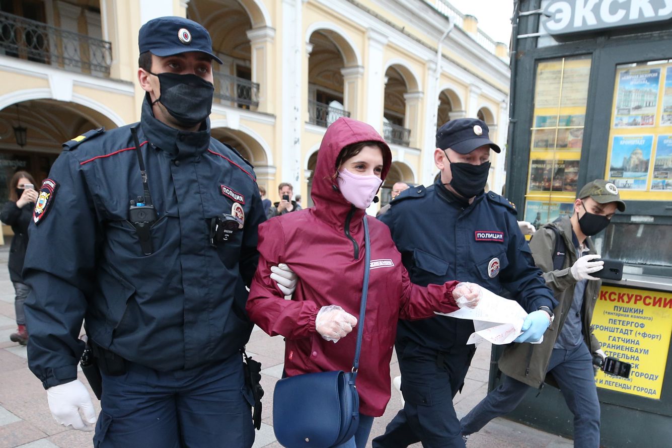 В Санкт-Петербурге несколько человек вышли на пикеты у Гостиного двора. Там задержали девять человек.