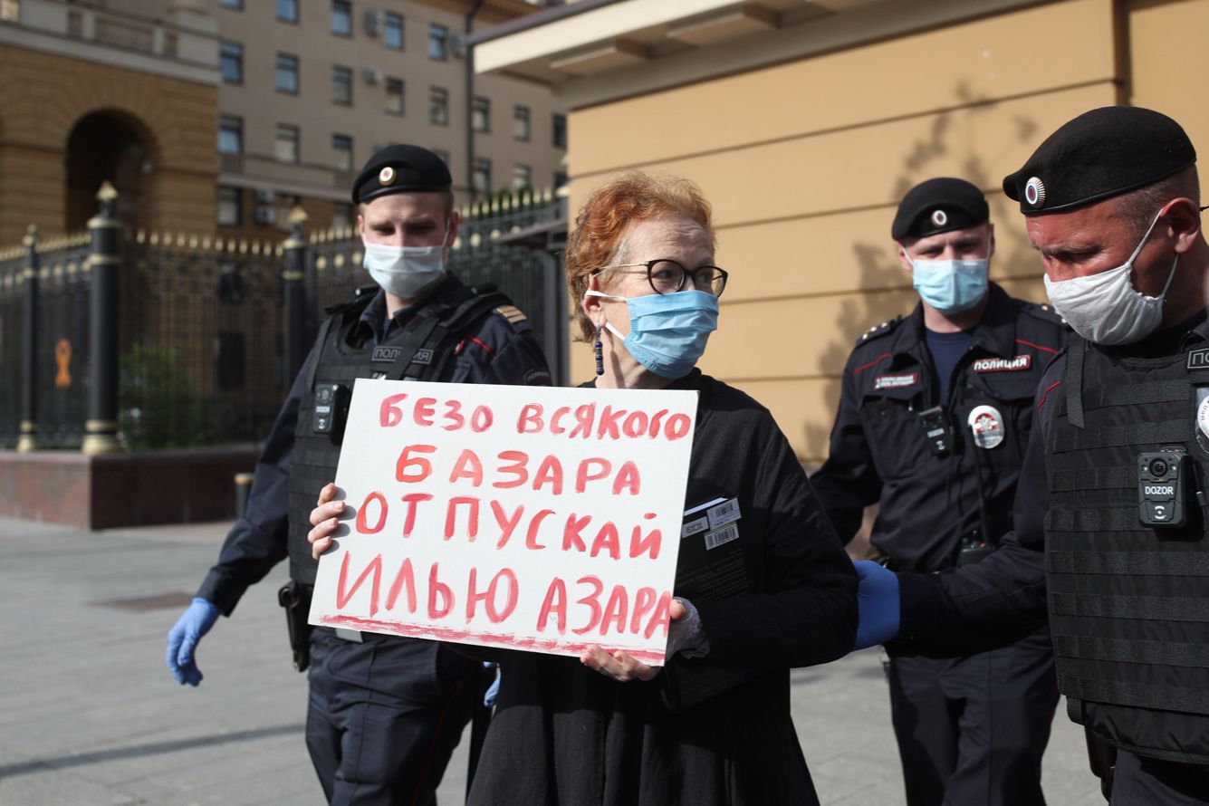 В Москве 28 мая прошла серия одиночных пикетов в поддержку журналиста и муниципального депутата Ильи Азара. Утром Азар получил 15 суток административного ареста. Суд счел, что его одиночный пикет в поддержку создателя паблика «Омбудсмен полиции» Владимира Воронцова подпадает под административную статью о повторном нарушении законодательства о митингах.
