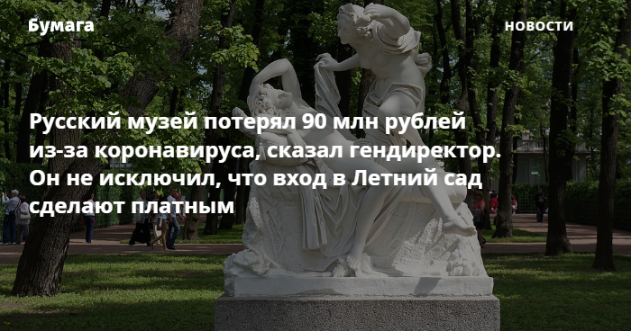 Генеральный директор Русского музея Владимир Гусев рассказал о потерях учреждения из-за коронавируса и не исключил, что вход в Летний сад сделают платным. Об этом пишут «Интерфакс» и «РИА Новости» со ссылкой на онлайн-выступление Гусева на пресс-конференции.