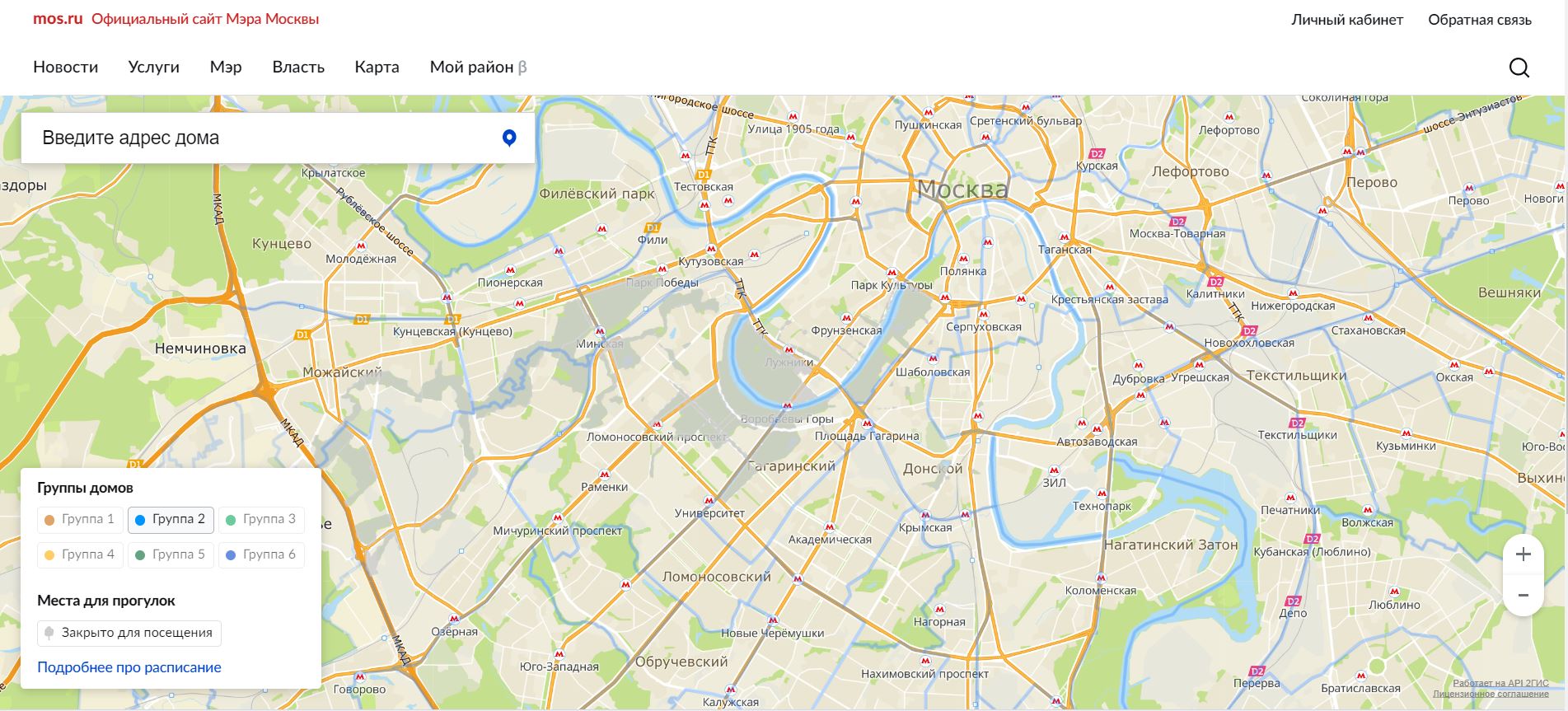 На сайте пользователю предлагают кликнуть на интересующий дом на карте или вбить адрес в строку поиска. «График прогулок будет также доступен в подъездах жилых домов и почтовых ящиках», — говорится на сайте мэрии.
