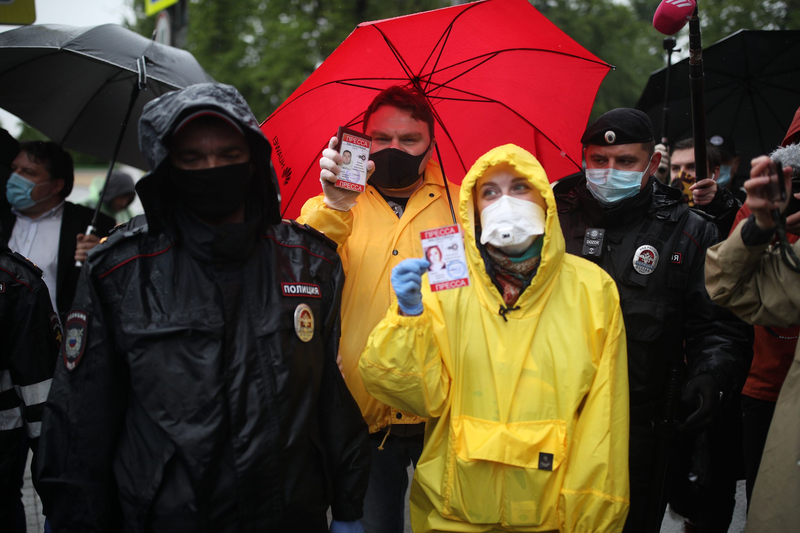 Дышать в автозаке нечем — об этом задержанные журналисты пишут в соцсетях и телеграм-каналах. В ответ на просьбу журналистов «Медузы» полицейские все-таки открывают в машине люк и несколько форточек. Одновременно другие сотрудники стремятся выполнить требование начальства — остановить протестную акцию. У журналистов по второму кругу проверяют документы. На этот раз пресс-карты недостаточно, необходимо редакционное задание. Бумага с подписью главного редактора есть у единиц, но задерживают только журналистов «Эха Москвы» Александра Плющева и Татьяну Фельгенгауэр. Накануне на них уже были составлены протоколы по статьям о нарушении правил проведения массовых акций и нарушении режима самоизоляции.