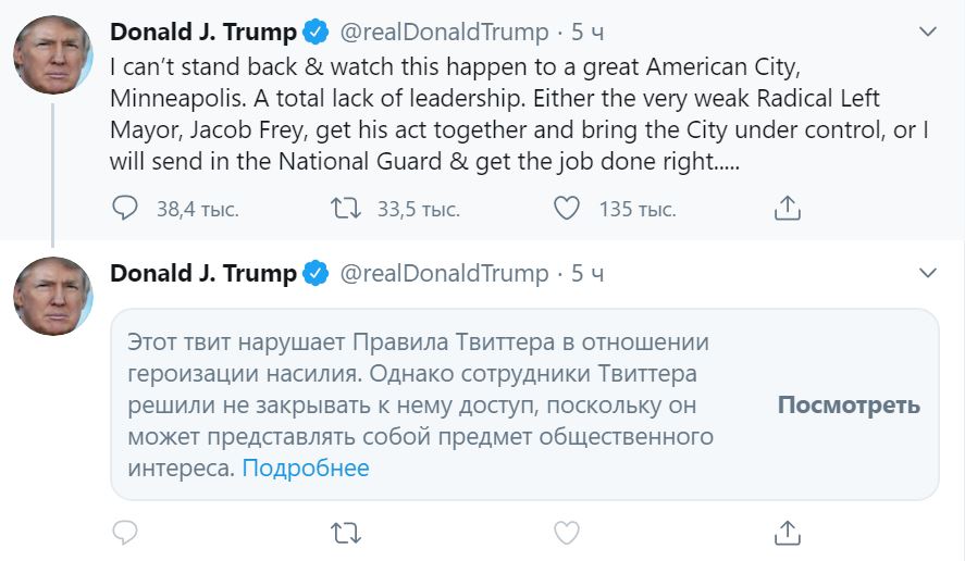 Вечером в четверг Twitter закрыл один из твитов Трампа, посвященных беспорядкам в Минниаполисе, предупреждением о том, что его текст "нарушает правила соцсети в отношении героизации насилия".