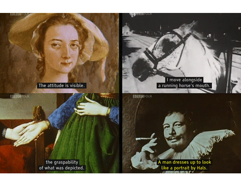 Этот и другие подобные приемы, использованные Джоном Бёрджером в сериале BBC «Искусство видеть» (Ways of Seeing, 1972), хорошо знакомы российскому зрителю по фильмам Леонида Парфенова: ведущий помещается в постановочное (или реальное) «историческое» место и, ведя оттуда репортаж, манипулирует в кадре с подлинными мемориальными предметами (или их муляжами) и фрагментами интерьеров или ландшафтов.