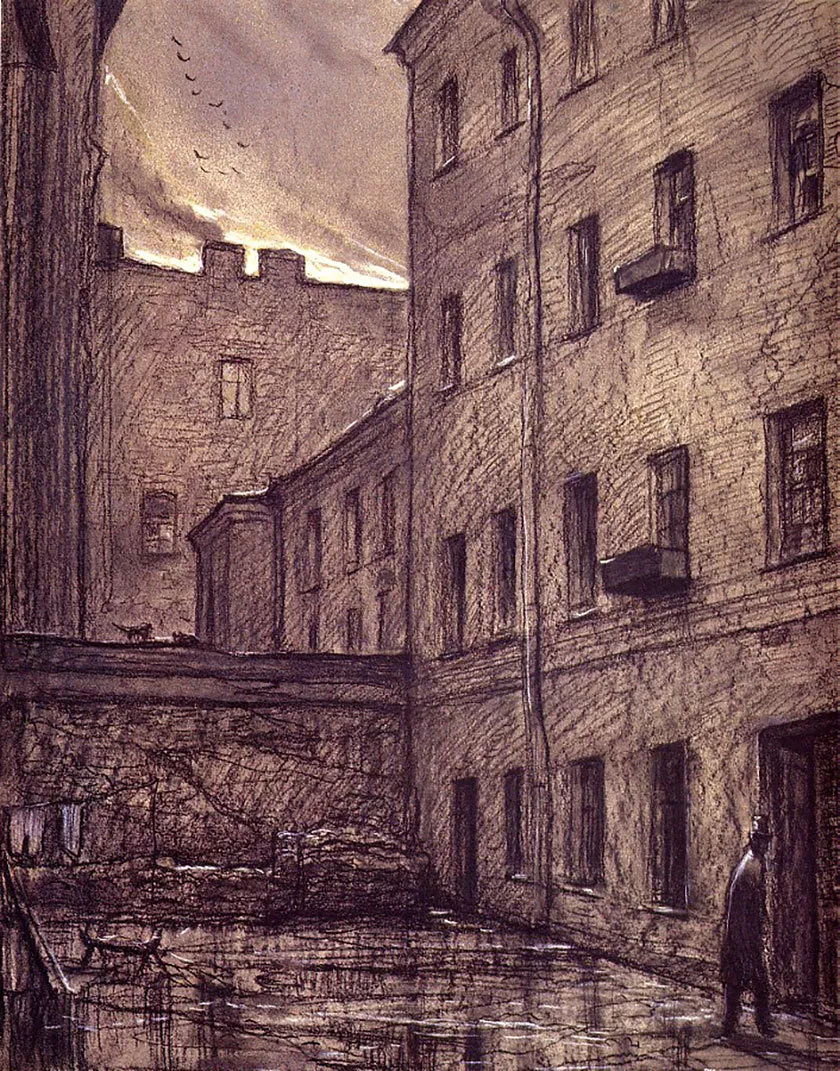 Иннокентий Анненский (его эссе «Достоевский в художественной идеологии» странным образом практически не отмечено редакторами седьмого тома) так описывал атмосферу городского сочинения Достоевского: «Роман знойного запаха известки и олифы, но еще более — безобразных, давящих комнат». Жилища ряда персонажей напоминают шкафы и гробы, поднятые под самые крыши тогдашних многоэтажек. Бедные персонажи романа — Раскольников, Разумихин, Мармеладовы, даже правовед (окончивший престижное учебное заведение) Порфирий — с полным основанием могут быть причислены к описанным в сочинениях 1840-х годов молодым Достоевским и его сверстником, одновременно с ним начавшим, но рано умершим Яковом Бутковым, «странным обитателям подоблачных вершин» (выражение Буткова), незадачливым женихам и безумцам. Кажется, их потомками в советском Ленинграде стали персонажи Зощенко: перечитайте романные страницы с косноязычными Капернаумовыми, поминками Мармеладова или вспомните, как Марфа Петровна Свидригайлова читала всему городу письмо Дуни.