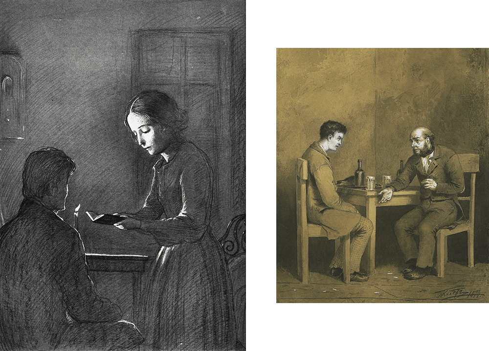 Илья Глазунов. Соня читает Раскольникову Евангелие. Иллюстрация к «Преступлению и наказанию». 1960-е годы / Михаил Клодт. Раскольников и Мармеладов. 1874 год