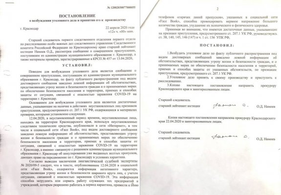 Татьяна Захарова работает помощником главы Западного округа Краснодара. Повод для возбуждения уголовного дела следователь увидел в сообщении Захаровой от 12 апреля, где чиновница пишет, что с 13 апреля старые пропуска прекращают действовать, а новые будут оформлять онлайн. Городская администрация в тот же день опубликовала пост Татьяны Захаровой с пометкой «фейк».