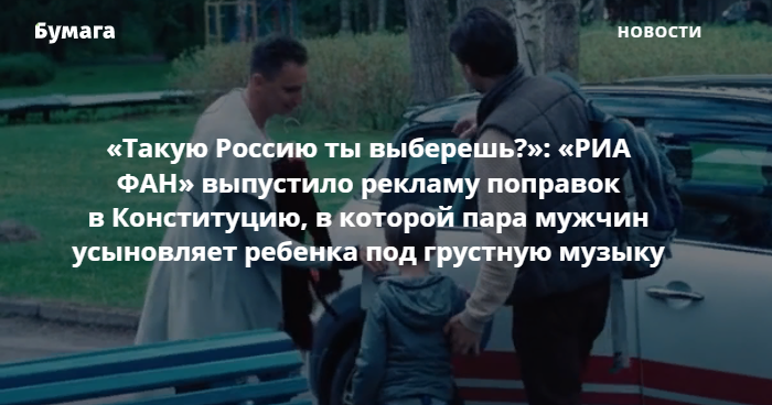 Петербургское издание «РИА ФАН», связываемое с «фабрикой троллей» и Евгением Пригожиным, опубликовало в соцсетях рекламу поправок в Конституцию. В ней показывают пару мужчин, усыновляющих ребенка, и напоминают, что одна из поправок предлагает закрепить понятие брака как союза мужчины и женщины.