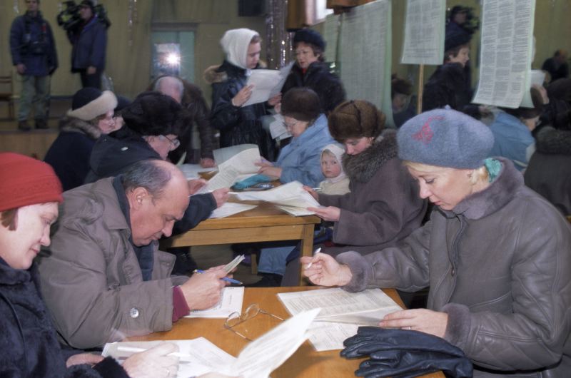 12 декабря 1993 года. Выборы депутатов Совета Федерации, Государственной думы ФС РФ, Московской городской думы и всенародное голосование по проекту Конституции РФФото: Владимир Федоренко/РИА Новости Несмотря на почти полную монополию Кремля на СМИ и административный ресурс, а также на самую активную агитацию, в голосовании 12 декабря, по данным Центральной избирательной комиссии, приняли участие только 58 миллионов человек, немногим более половины (54,8 процента) избирателей. Из них за принятие нового проекта Конституции проголосовало 58,4 процента.