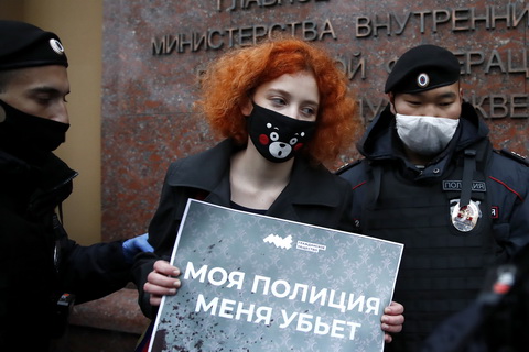 Фото: 02.06.2020. Россия. Москва. Девушка с плакатом во время задержания сотрудниками полиции у здания ГУ МВД РФ по городу Москве на Петровке, где проводится серия одиночных пикетов, вызванная гибелью жителя Екатеринбурга, который оказал сопротивление сотрудникам Росгвардии при задержании. Артем Геодакян/ТАСС