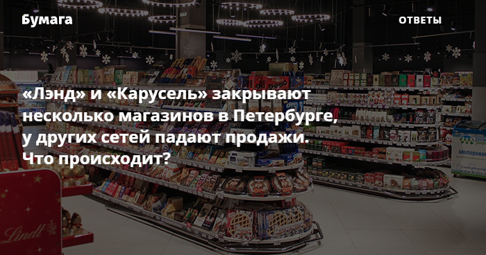 В Петербурге закрыли четыре супермаркета сети «Лэнд», которая работает в городе почти 22 года. Параллельно с этим гипермаркеты «Карусель» массово переформатируют в более компактные «Перекрестки». Аналитики не связывают происходящее с пандемией напрямую, но не исключают ее влияния на решения ретейлеров. Объем продаж снижается почти во всех продуктовых точках Петербурга — в том числе из-за падения реальных доходов населения. По оценкам экспертов, под угрозой закрытия находятся региональные сети и магазины в сегменте «средний-плюс». «Бумага» объясняет, что происходит на рынке продуктового ретейла.Почему закрываются супермаркеты «Лэнд»?