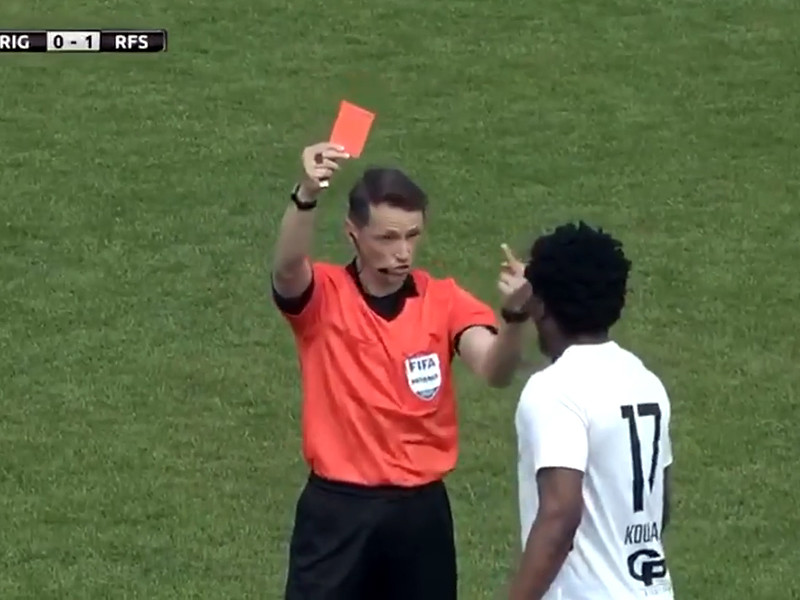 На 75-й минуте товарищеского матча между рижскими клубами РФШ и "Рига" (2:0) 35-летний рефери удалил темнокожего игрока РФШ Аллена Седрика Куадьо за оскорбление соперника, показав озадаченному ивуарийцу средний палец.
