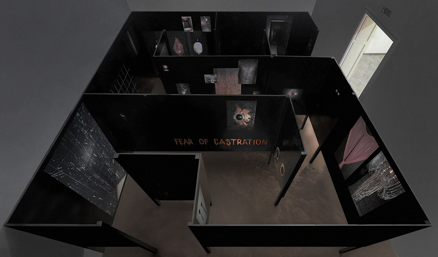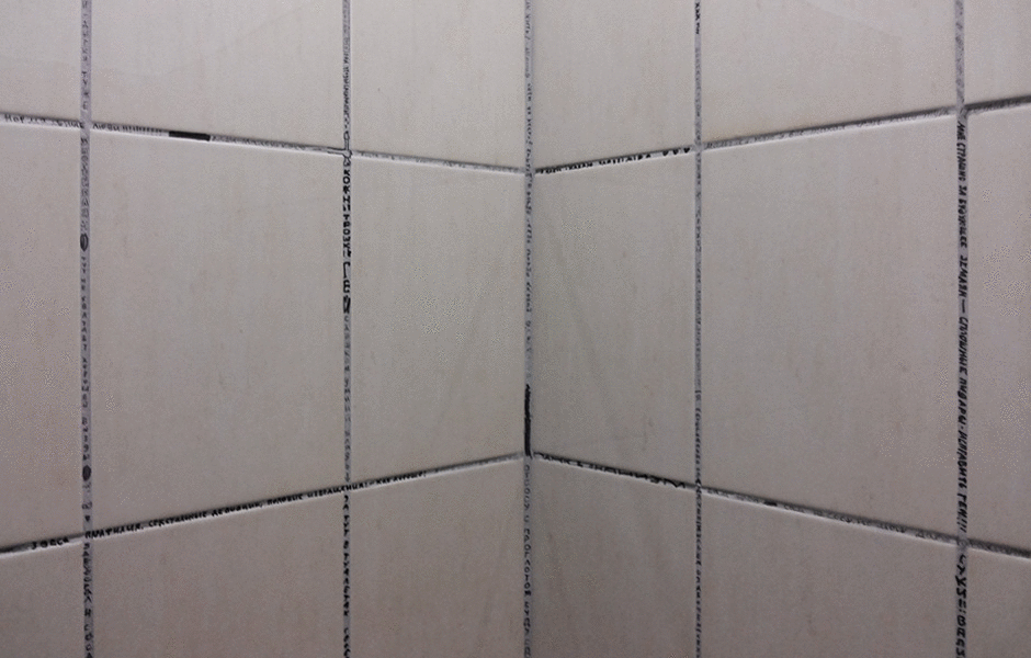 Обнаруженные художником в общественных туалетах анонимные надписи, аккуратно загнанные их авторами в цементные стыки между кафельной плиткой так, что они не нарушают «стерильности» санитарного пространства. На фото: вариант инсталляции «Зоны вытеснения (Тупик)» (галерея «Ў», Минск, 2014 г.) и на выставке «Ain't Nobody's Business» в PinchukArtCentre (Киев, 2019 г.).