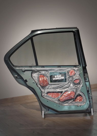 © Сергей Шабохин Сергей Шабохин, Павел Матышевский. Контрабанда биоматериалов (дверь автомобиля / BMW E6-43R-00048). 2019 Одна из работ о контрабандной перевозке мяса через польско-белорусскую границу. Леденёв: Касательно национальной самоидентификации: мне вспоминается анекдот, рассказанный на одной из лекций Борисом Гройсом. После его эмиграции на Запад одна голландская — тут я могу путать детали — коллега упорно называла его «русским философом», на что Борис отвечал, что «русским» философом себя не считает. И Гройс, и его коллега настаивали на своем, пока женщина однажды не подошла к нему и не сказала: «Кажется, я поняла: вы из тех русских, которые упорно не хотят быть русскими». Этим рассказом Гройс иллюстрировал идею о «взгляде другого», которому сложно противостоять и который определяет в том числе и твою национальную самоидентификацию. С другой стороны, известен пример Юрия Лейдермана: он с определенного момента начал настаивать на самоопределении себя именно как украинского художника. Вариант, предложенный тобой («художник из Белоруссии, работающий в Польше»), кажется мне вполне корректным, хотя, увы, несколько громоздким в плане языка. То ли дело емкое английское Belarusian-born Polish-based artist. Хочется пошутить про негибкость русского языка, который идеально подходит для литературы, но не дипломатии.