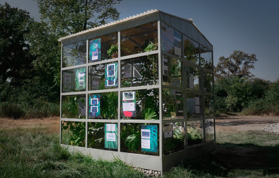 «St()re #8: реконструкция оранжереи (Парник гласности)» (2017). Павильон, установленный художником в ботаническом саду им. Э.З. Гореева. На стены павильона художник поместил постеры с изображением произрастающих в парке растений, поверх которых приклеил статьи из прессы об экоактивизме, экологических катастрофах и другие тексты правозащитного характера. На другом фото: «St()re #6: маки на могилах» (2015). Вид инсталляции в музее Максима Богдановича (Минск).