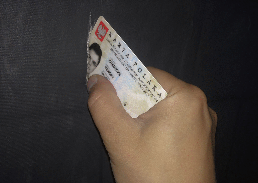 Карта поляка — документ, выдаваемый лицам, сумевшим доказать свое польское происхождение, дающий право жить, учиться и работать в Польше. Сергей Шабохин, имеющий польские корни по линии матери, прошел долгий бюрократический путь с целью получения карты и в своем проекте рефлексирует относительно возможности физического и психологического преодоления геополитических границ. На фото: холст, прорезанный картой поляка (2018).