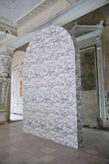 © Сергей Шабохин Из цикла «Социальный мрамор». «St()re #11. Слепое окно (Сквозь)». 2019 Смонтировано в фойе здания ХХ века в Днепре, реконструировавшегося под строительство Центра современной культуры Днепра. Конструкция из виниловой пленки с рисунком под мрамор была установлена напротив выбитого окна, форму которого повторяла. На обратной стороне пленочной глыбы располагался текст-глоссарий: об окне-обманке, о судьбе здания центра культуры, об опустевших зданиях в бывшем еврейском гетто и пр. Шабохин: Вопрос национальной самоидентификации актуален для меня. Я определенно могу маркировать себя как художника из Белоруссии, и как эксперт в области белорусского современного искусства я являюсь носителем знаний и непосредственным участником важных событий и процессов. К тому же я работаю над созданием базы данных по белорусскому искусству, и мне легко следить за происходящим извне, особенно в эпоху интернета. Держать руку на пульсе помогают также общение с коллегами, периодические встречи и коммуникация в социальных сетях.