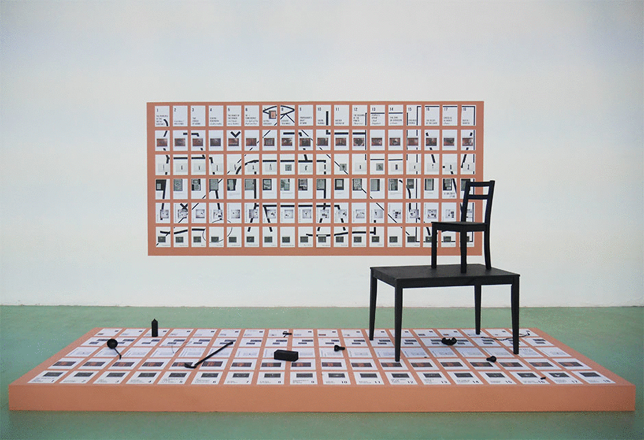 Артефакты, которые можно использовать как орудия насилия. Например, стул, поставленный на стол, — известный метод запугивания граждан сотрудниками КГБ. На фото — так и не открывшаяся для широкой публики персональная выставка Сергея Шабохина «18 / Практики подчинения» (Минск, «Столовка XYZ», 2018 г.), работы «Карта» (2015) и «Стул на столе» (2018).