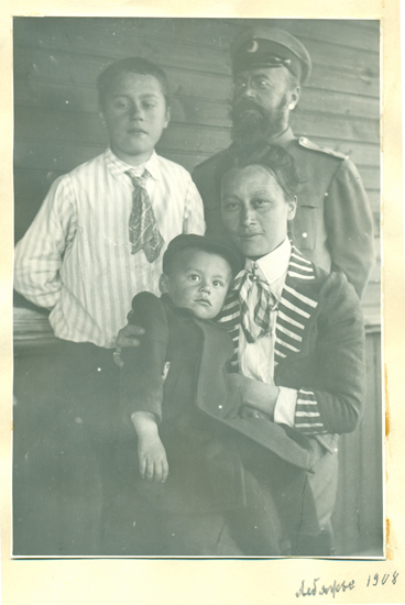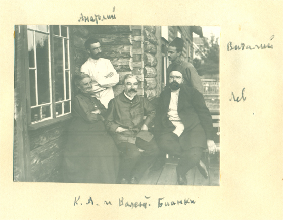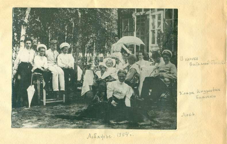 Фото 3. Лебяжье. После 1908 года. Фото семейства Бианки из альбома Егуновых, имена подписаны рукой Егунова: сидят Валентин и Клара Бианки, их дети — Анатолий, Виталий и Лев Как тенишевец, чьи естественнонаучные интересы поддерживались самими принципами обучения, и сосед семейства Бианки [11] по дачам в Лебяжьем (см. фото 3 из архива А.Н. Егунова с его же пометками — семейство Бианки на даче в Лебяжьем, после 1908 года), молодой Егунов не мог не знать и не интересоваться наличием ящериц в овраге Петергофского ручья. Поэтому присутствие одной из них в поэме кажется почти естественным, даже несмотря на способность этой ящерицы говорить.