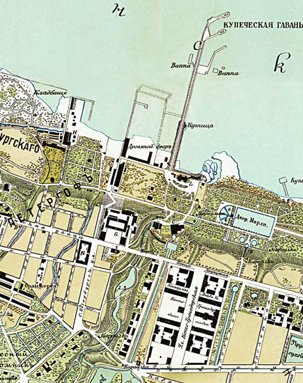 Вот фрагмент плана Петергофа 1909 года из юбилейного путеводителя М.М. Измайлова [10]. На нем в самом центре хорошо различим овраг Нижнего Английского парка с Нижним прудом, многочисленными мостиками и аллеями. Справа от оврага — казармы конных гренадеров, полка, исторически сформированного из драгунской гвардии, чьи казармы находятся слева, на западной стороне от Английского парка. Вверху — причал Купеческой гавани в устье Петергофского ручья, а чуть ниже значком L обозначено здание кофейного дома «Бель-Вю» при морском вокзале.