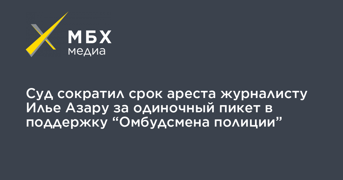 Мосгорсуд сократил на пять суток срок ареста журналиста Ильи Азара, который получил 15 суток за то, что вышел к зданию столичного МВД с одиночным пикетом в поддержку создателя паблика «Омбудсмен полиции» Владимира Воронцова. Об этом сообщает «Апология протеста».