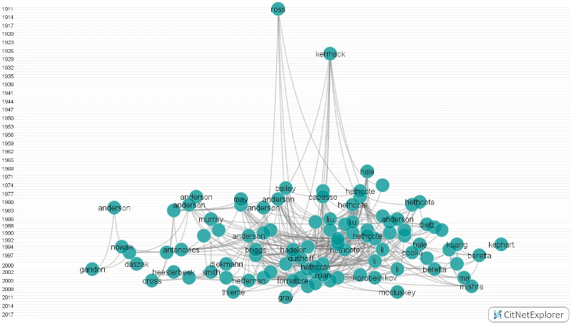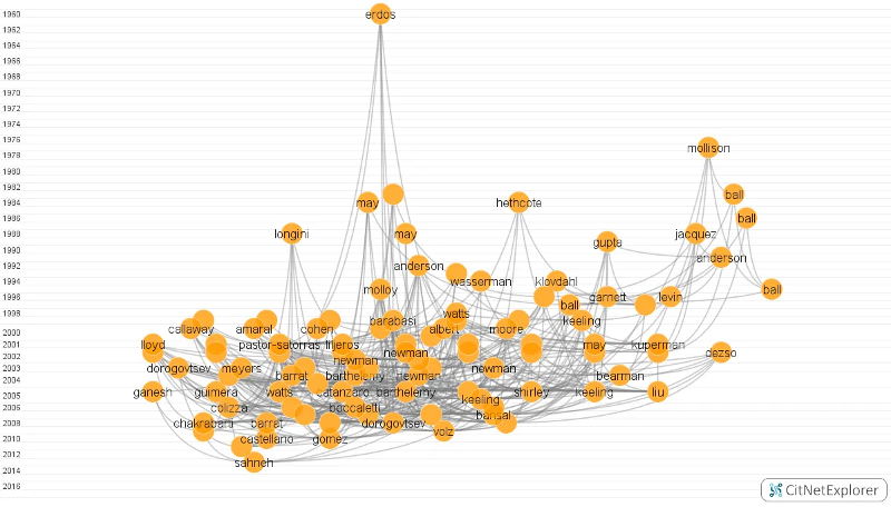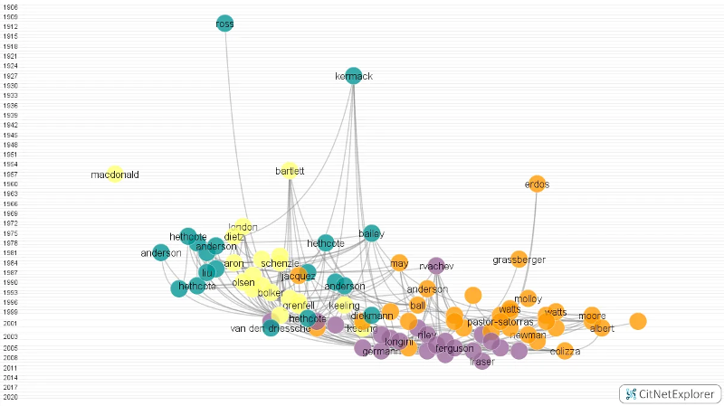 Карта прямого цитирования публикаций про эпидемиологические модели, оранжевый кластер Оранжевый кластер посвящён сетевому подходу к моделированию эпидемий. Население представлено как сеть, где узлы сети — люди, а связи между ними — контакты. От заражённого индивида вирус передаётся тем, кто с ним контактирует, а от них — дальше по сети. В этом кластере часто ссылаются на теорию случайных графов, разработанную Erdös and Rényi (1959, 1960, 1961).