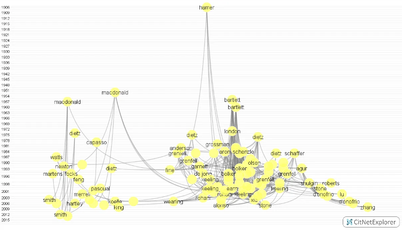 Карта прямого цитирования публикаций про эпидемиологические модели, жёлтый кластер Этот кластер начинается статьями на тему моделирования распространения кори. В более поздних публикациях предыдущие модели совершенствуются через включение новых факторов и распространяются на различные заболевания.