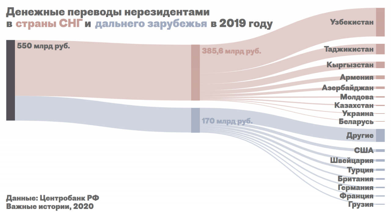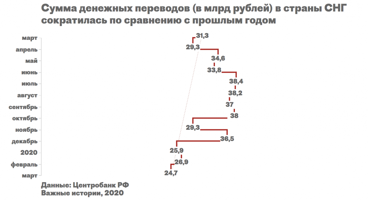 Фото: «Важные истории» Уже в марте этого года (это самые свежие данные, опубликованные ЦБ) месячная сумма переводов в страны СНГ заметно сократилась: если в прошлом году за март из России отправили 31,3 миллиарда рублей (481 миллион долларов, среднемесячный курс доллара к рублю в марте 2019 года — 65 рублей), то в 2020 году — 24,7 миллиарда рублей (335 миллионов долларов, средний курс в 2020 году — 73,7 рубля за доллар), на 21% меньше.