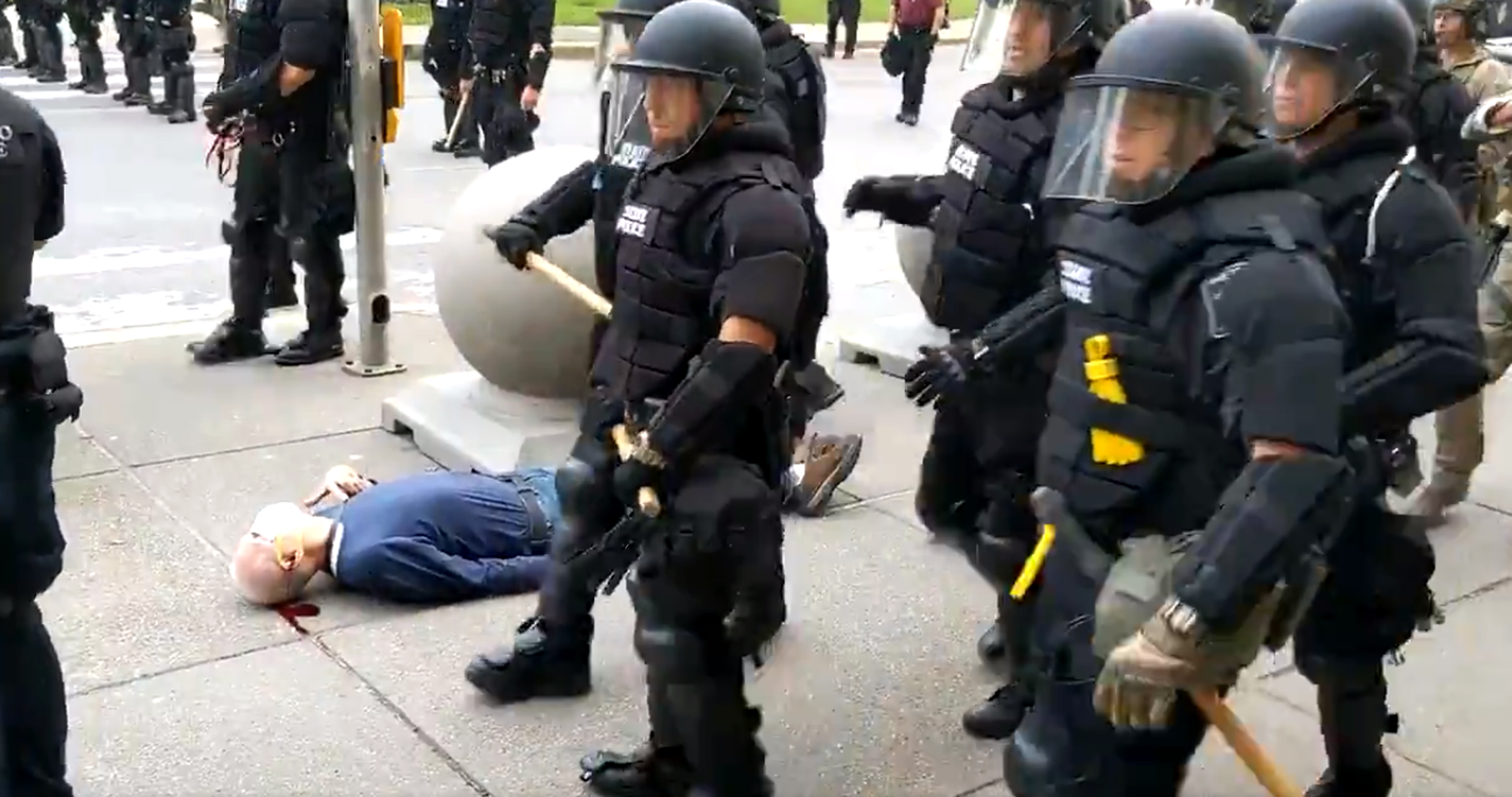 WARNING: GRAPHIC CONTENT Video shows police in Buffalo, New York, in riot gear shoving a white-haired man to the ground and appearing to march past him https://t.co/JOGKvQ5UNd pic.twitter.com/kCak153VH2