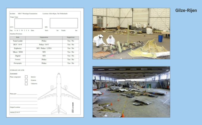 Первым шагом стал осмотр всех останков погибших для возможного нахождения «посторонних предметов». Сторона обвинения продемонстрировала видео поисков металлических фрагментов в телах жертв катастрофы. Экспертиза показала, что остатки шрапнели в телах соответствуют тем же остаткам, которые были предоставлены с места катастрофы свидетелями — и это шрапнель от ракеты «Бука». (Среди свидетелей бывшие российские наемники, сепаратисты с Донбасса, журналисты, местные жители. JIT неоднократно обращалась к свидетелям через интернет и радио-рекламу, чтобы собрать показания).