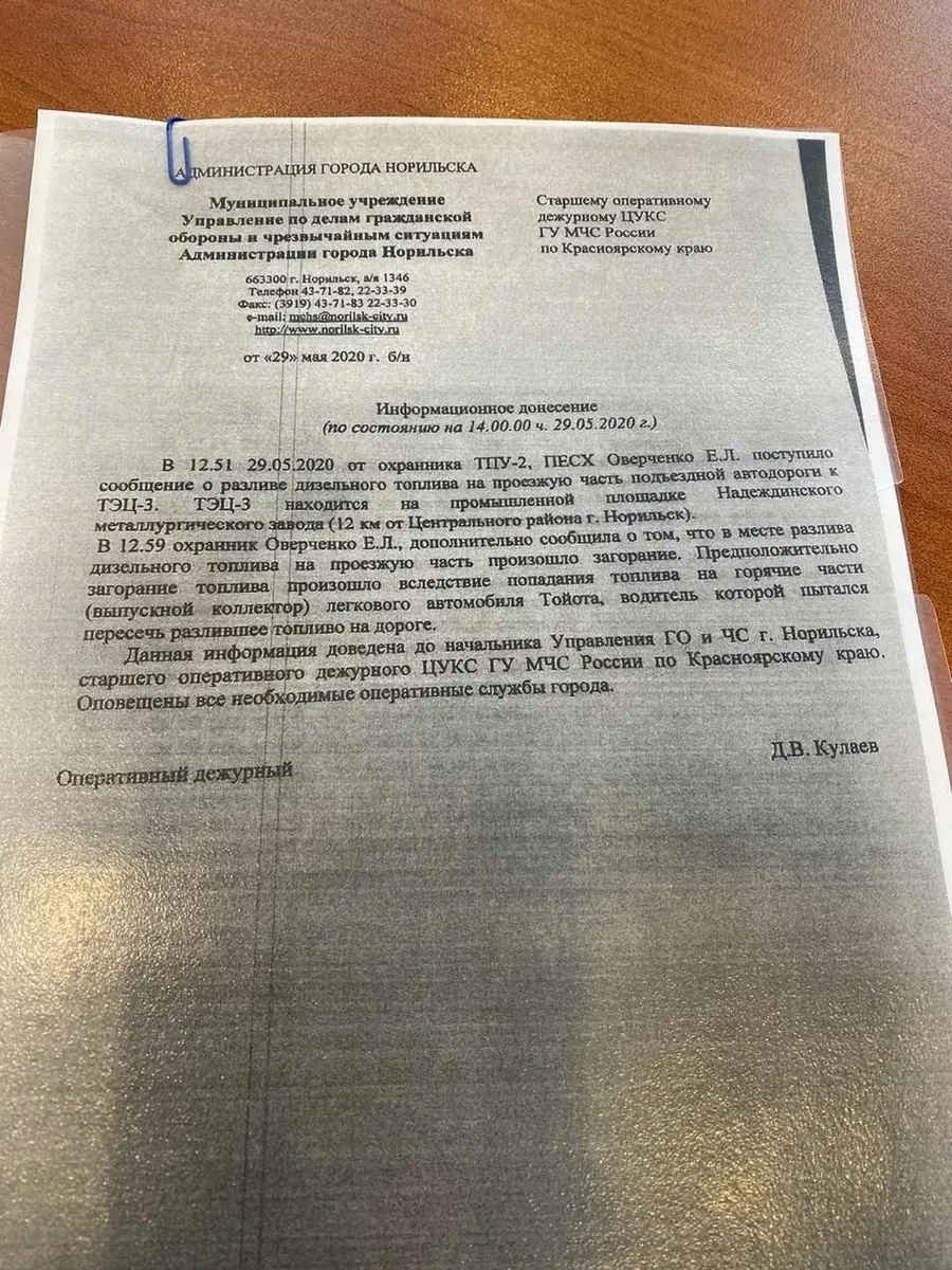 Оперативный дежурный управления МЧС Норильска Кулаев в два часа дня по местному времени доложил в краевое управление МЧС, что в 12 часов 51 минуту 29 мая поступило сообщение о разливе дизтоплива.