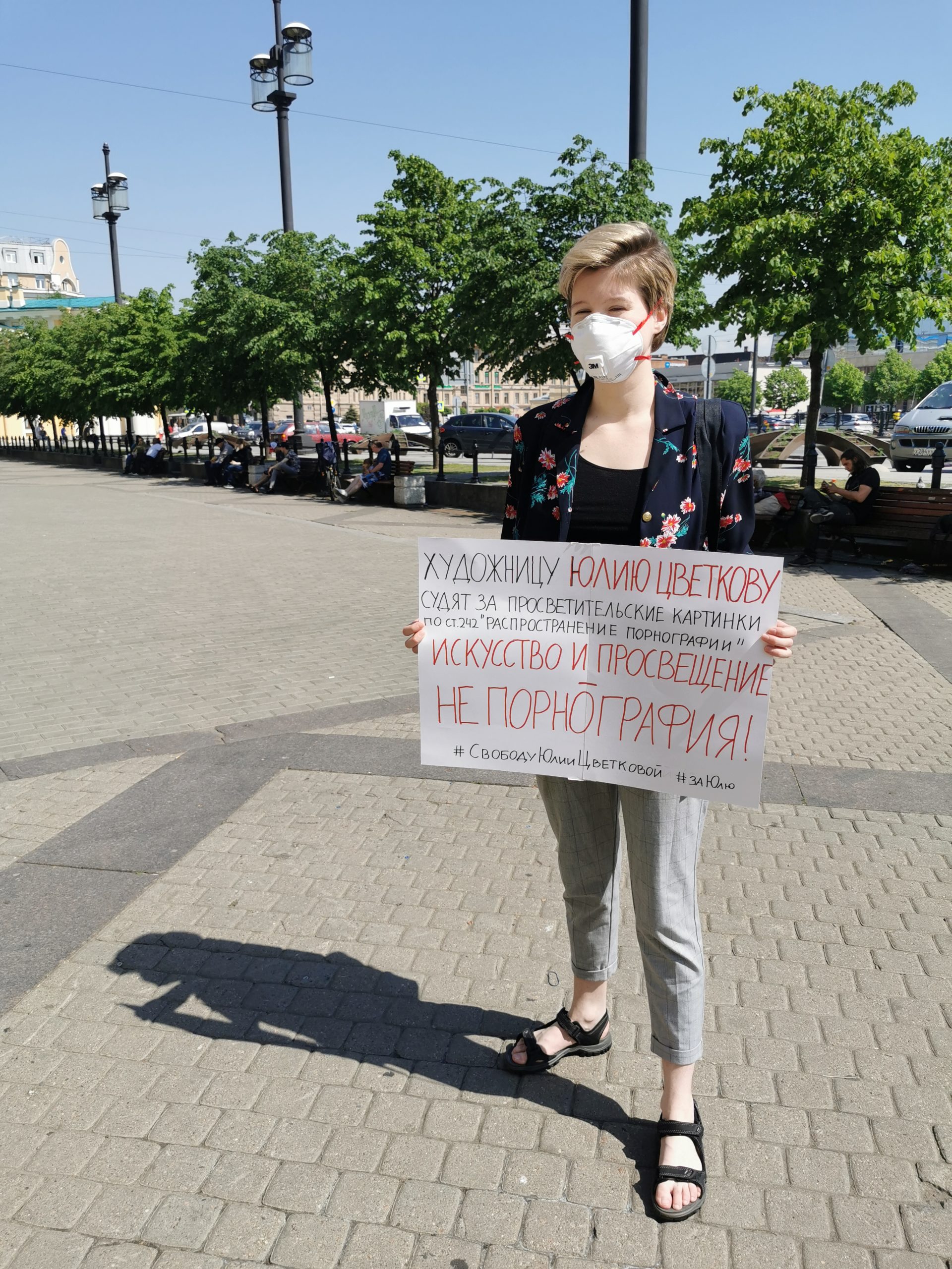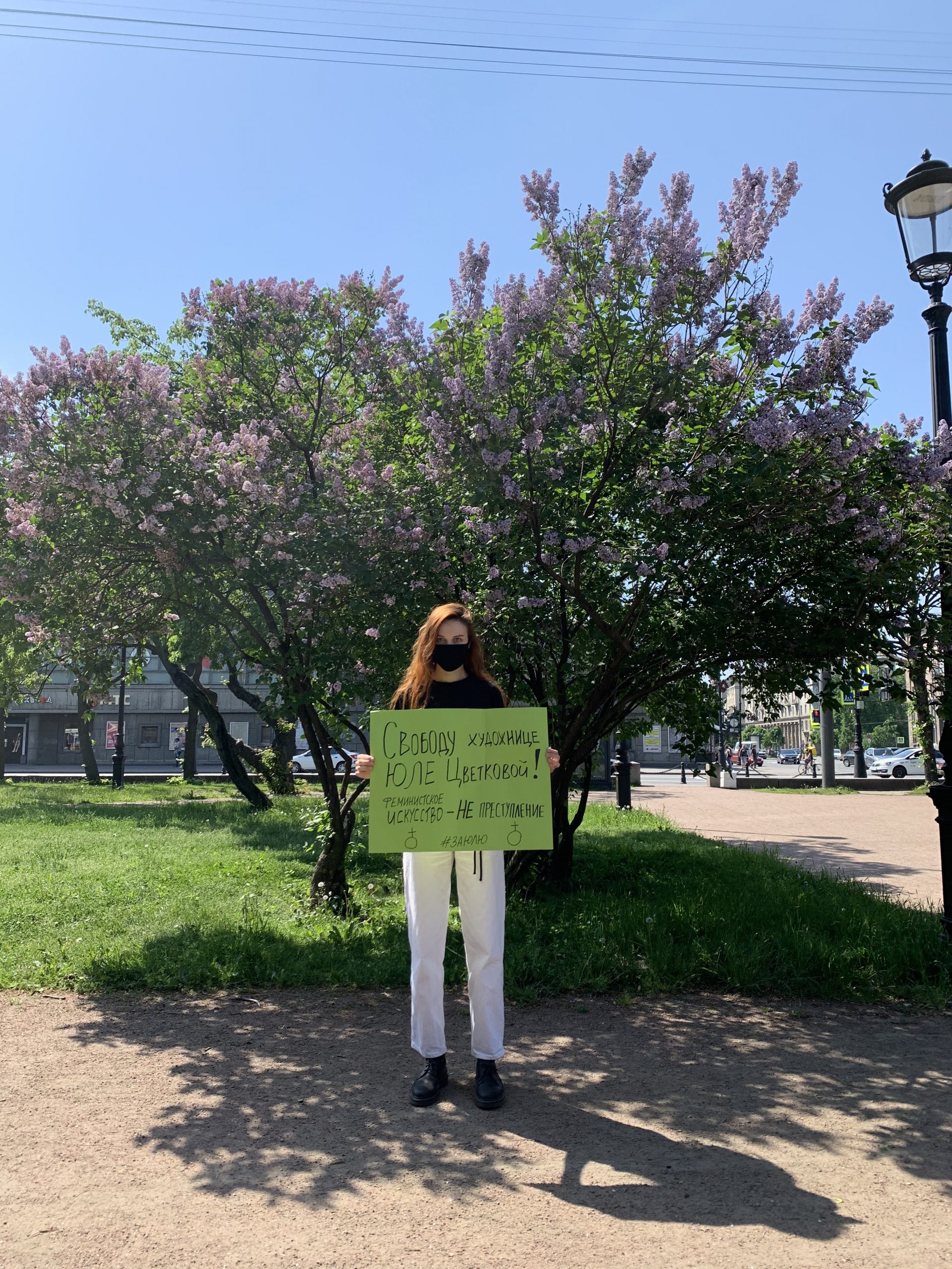 В Петербурге днем 9 июня проходят синхронные одиночные пикеты «За Юлю» в поддержку художницы и ЛГБТ-активистки Юлии Цветковой. Об этом «Бумаге» рассказала координаторка акции Лёля Нордик.